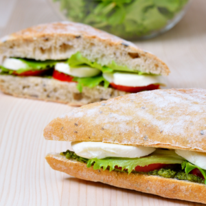 Slice a baguette length-wise and spread a generous layer of pesto on the bottom baguette. Layer a thick stack of spinach above the pesto and top that with thin tomatoes. Add mozzarella circles- I often do two pieces of thin mozzarella with one piece of American cheese in between for some variety. Add a second layer of spinach, and top with another thin layer of mozzarella. Top the second slice of bread with Italian dressing and press that onto the sandwich. Clean and spray anti-stick spray onto the panini press, before pressing your sandwich for 30-40 seconds (adjust based on your panini press) until sandwich is somewhat melty and golden-brown lines have formed on top. Enjoy!! 🥪