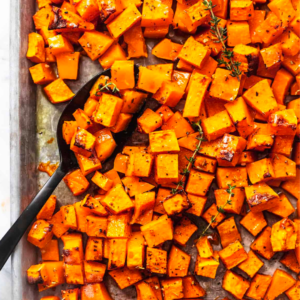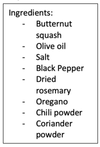 First, dice the squash â prepare cubes that are mostly even-sized. Prepare a mixture of the oil and spices â salt, black pepper, chili powder, coriander powder and, if you wish, ginger powder. The consistency should be sticky. Now, coat the squash thoroughly in this mixture. Once the squash is covered, place on a baking sheet on a pan and bake for about 20 minutes at 350ËF, or until squash achieves desired texture đ