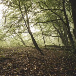 The park grove is shady and the ground is covered in dry leaves, which makes it hard to walk quietly. The visitor man turns around suspiciously at one point, but Jane jumps behind a tree and luckily he doesn’t see her. He turns back to Mr. Bennet and says, “Gosh, I’m jumpy.”