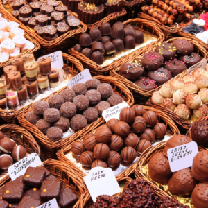 Embarrassed, I hurried past and entered the store. Brightly colored boxes of sweets lined the shelves: candy-apple green, sharp royal blue, multi-colored stripes, sparkling drops in gold, silver, and purple filling glass bottles which threw rainbow reflections around the walls. Pounds and pounds of chocolate, white chocolate, and caramel weighed down the wooden racks. I tried to admire all the offerings, but I was wrapped in my thoughts about school. The sun was beginning to break through the clouds and the day’s weather seemed to be improved.