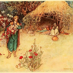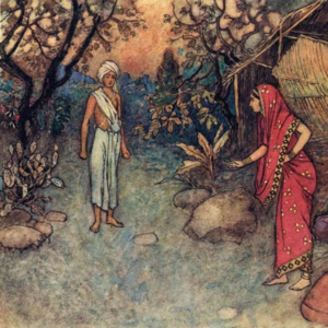 It was to be an index of his life. Saying this, he bade farewell, and the old man led him into the forest. On the way, a baby hawk saw him pass. It said to its mother, “Please mother, that boy is so handsome and elegant, he must be a prince. Do let me join him!” The mother hawk gave permission, and the hawk perched on the prince’s shoulder. A puppy lying with its siblings and mother did the same, and the old man, prince, hawk, and puppy walked further into the forest. The boy lived with the mendicant in his hut of leaves far from the kingdom and spent his days hunting and gathering flowers for the man’s rituals. He was allowed to go where he pleased, but the man told him to never go north. One day, the prince shot at a deer, but it ran north. Not thinking of the direction, the prince followed it into a house, where a beautiful woman was waiting. “Play a game of dice with me!” she begged, and the prince, enchanted, obeyed. In the game, the boy lost his puppy, his hawk, and finally, himself! The woman, who was a Rakshasi (demon) transformed into her true self, and put the three into a hole, saving them for a meal.