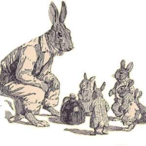 other animals. He was found out, and left in a hurry to avoid the angry mob. The Bear however, caught hold of the Rabbit’s long tail and pulled it out. To this day, Rabbit only has a small stump of a tail. He is still very sour about it.